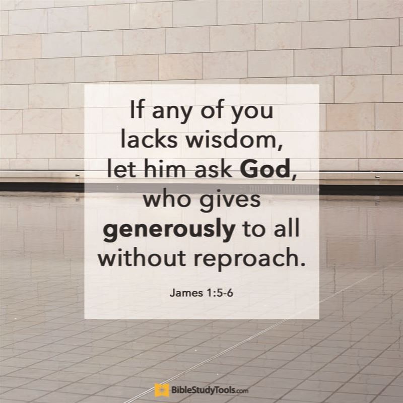 “If any of you lacks wisdom, let him ask God, who gives generously to all without reproach, and it will be given him. But let him ask in faith, with no doubting, for the one who doubts is like a wave of the sea that is driven and tossed by the wind. For that person must not suppose that he will receive anything from the Lord.” James 1:5-7